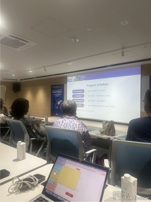 6月中旬よりオンラインでのオリエンテーションおよびミーティングが開始され、10名規模の国際チームが編成された。本ワークショップでは、監督・プロデューサーに加え、各チームにAIアーティストが配置されている点が特徴的であり、AIを前提とした映画制作体制を学ぶ機会となった。当初提示されていた作品尺(5~10分)が、オリエンテーション時に5分以下へ変更されるなど、制作条件の調整を余儀なくされる場面もあったが、短期間で脚本を再構成し、企画を成立させた。オンラインミーティングを重ねながら、チーム内で作品の方向性を共有し、渡航前より撮影準備や役割分担を進めた。